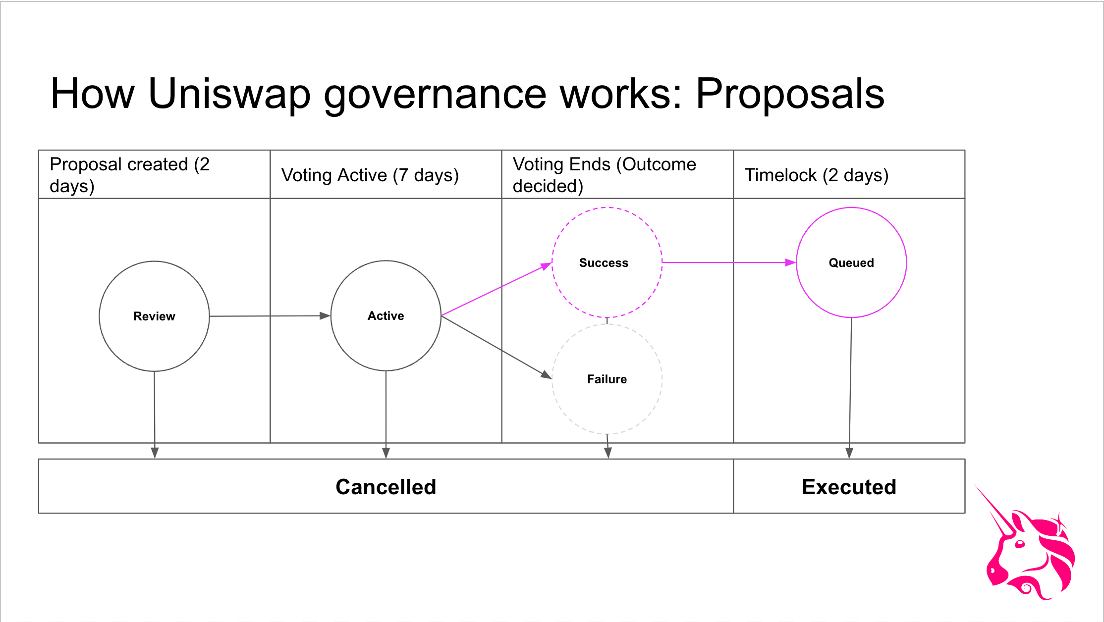 Understand the three-phase Uniswap governance lifecycle, including RFC, Temperature Check, and Onchain Vote.