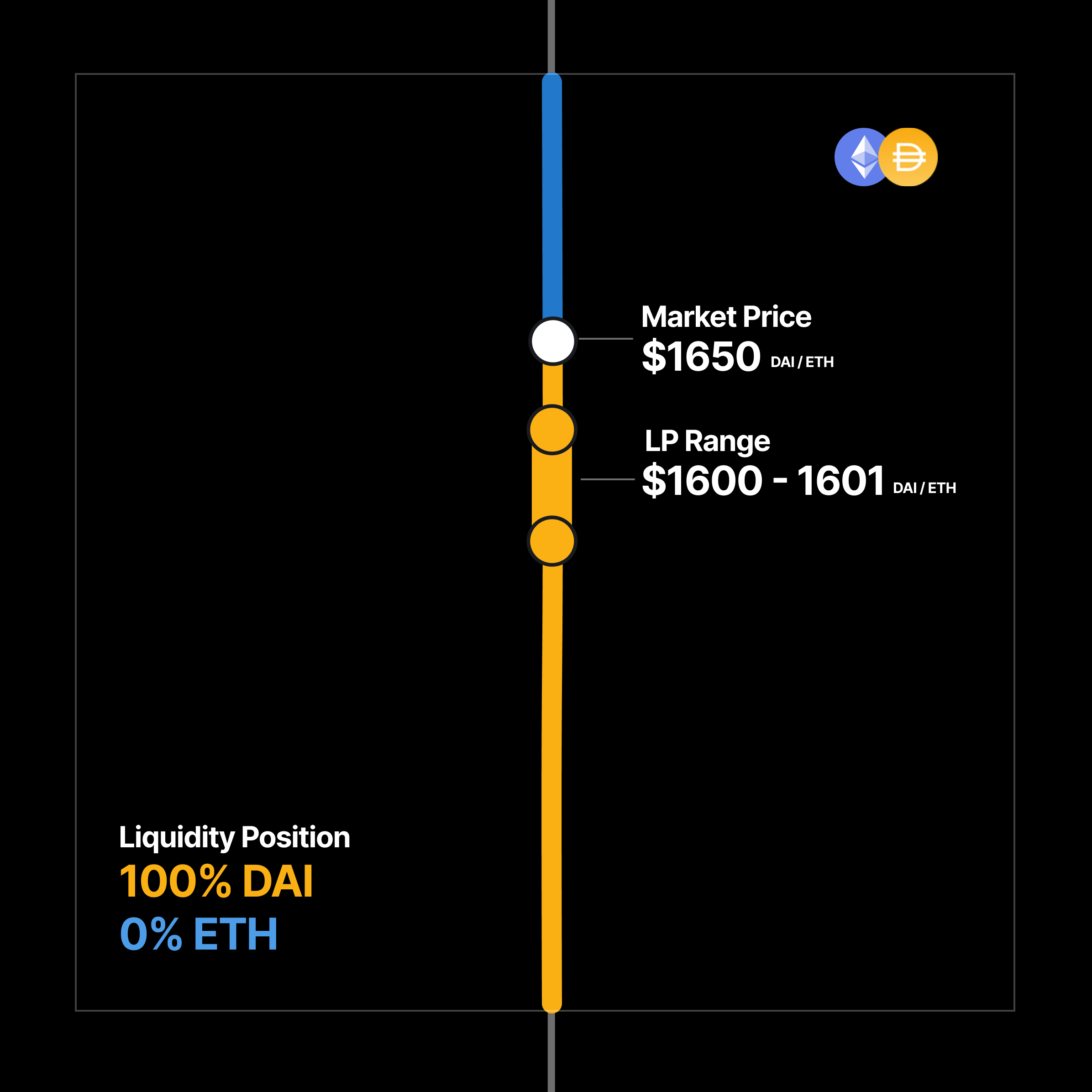 The current price of a DAI / ETH pool is 1,500 DAI / ETH. You would like to sell your ETH for DAI when the price of ETH reaches 1,600 DAI / ETH. This is possible, as the price space above the spot price is denominated in the higher valued asset, ETH. You can provide ETH at a price of 1,600 DAI / ETH and have the order filled when the spot price crosses your position.