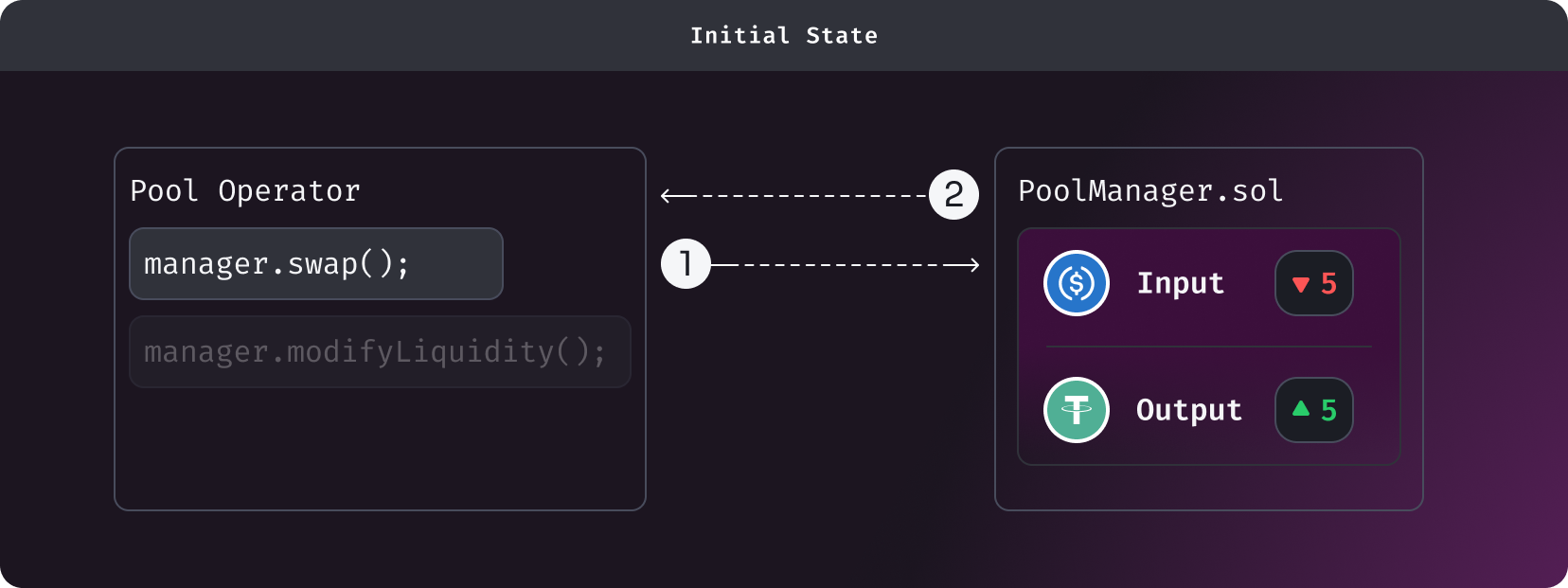 In the above example, we are swapping 5 USDC to 5 USDT to create liquidity with 15 USDC and 25 USDT. In between the operations (swap, modifyLiquidity), no token transfers are made