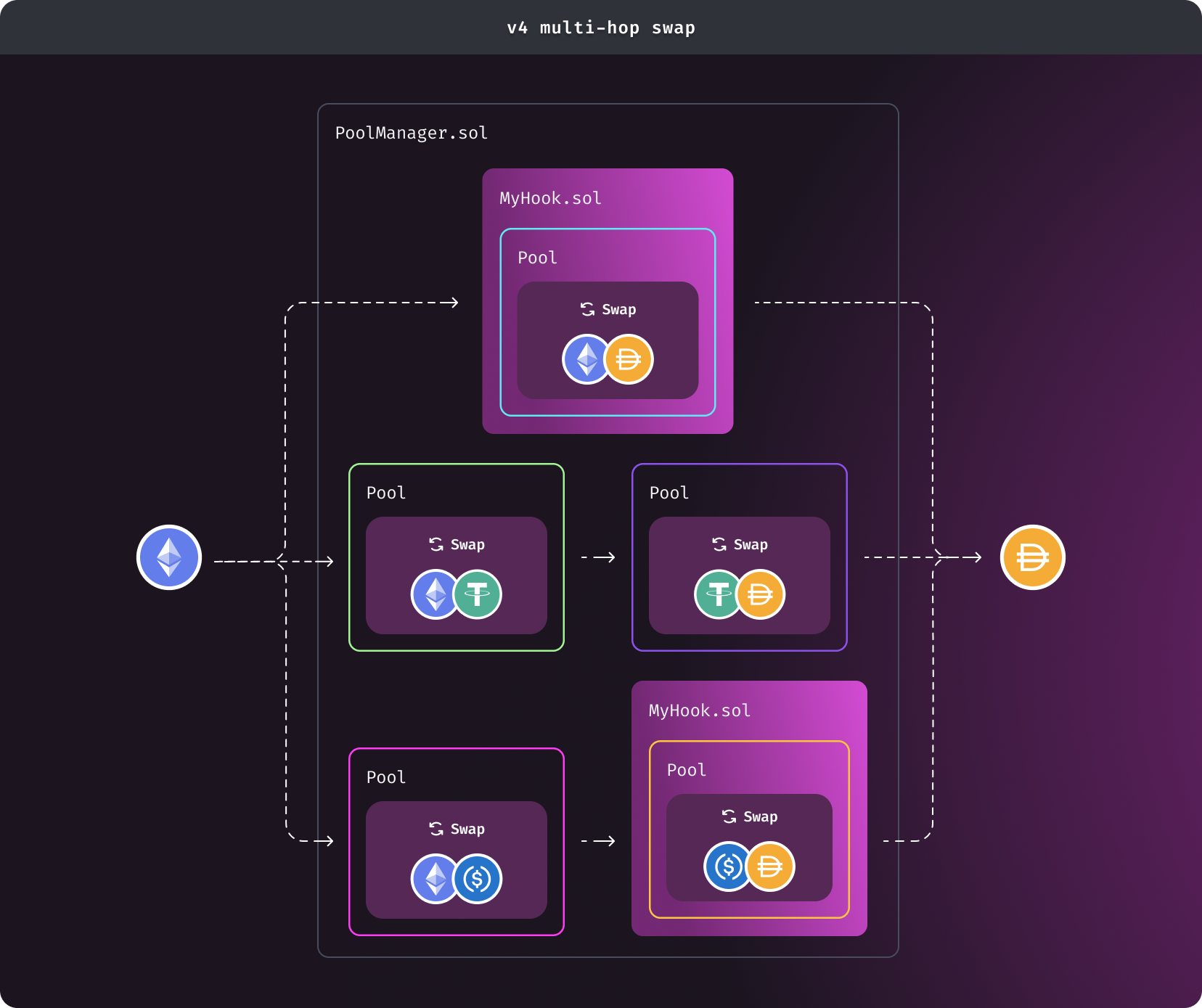 As shown in the above diagram, for example - let's say you want to swap ETH for DAI. Assuming this requires a multi-hop swap going from ETH to USDC and then from USDC to DAI.