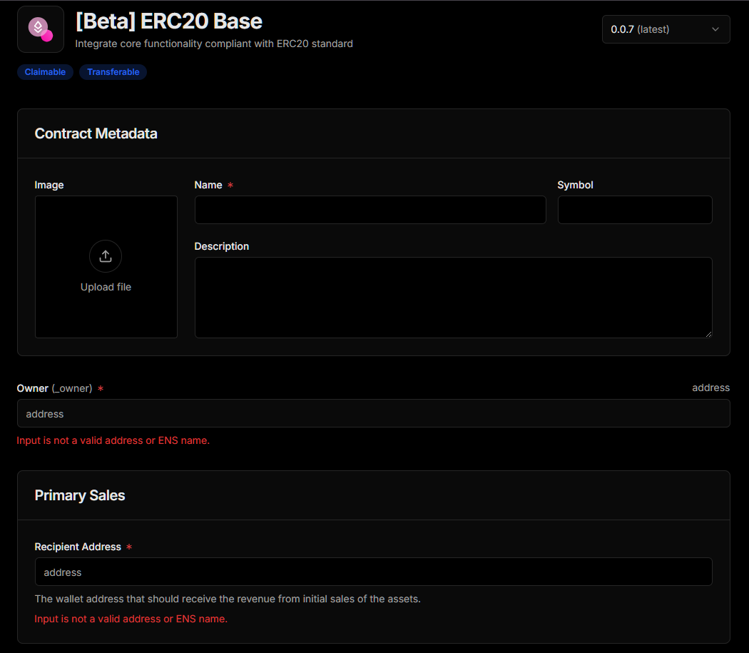 - The owner information should be a wallet you have access to as this will be set as the admin for this contract. By default it is prefilled to the currently logged in wallet address