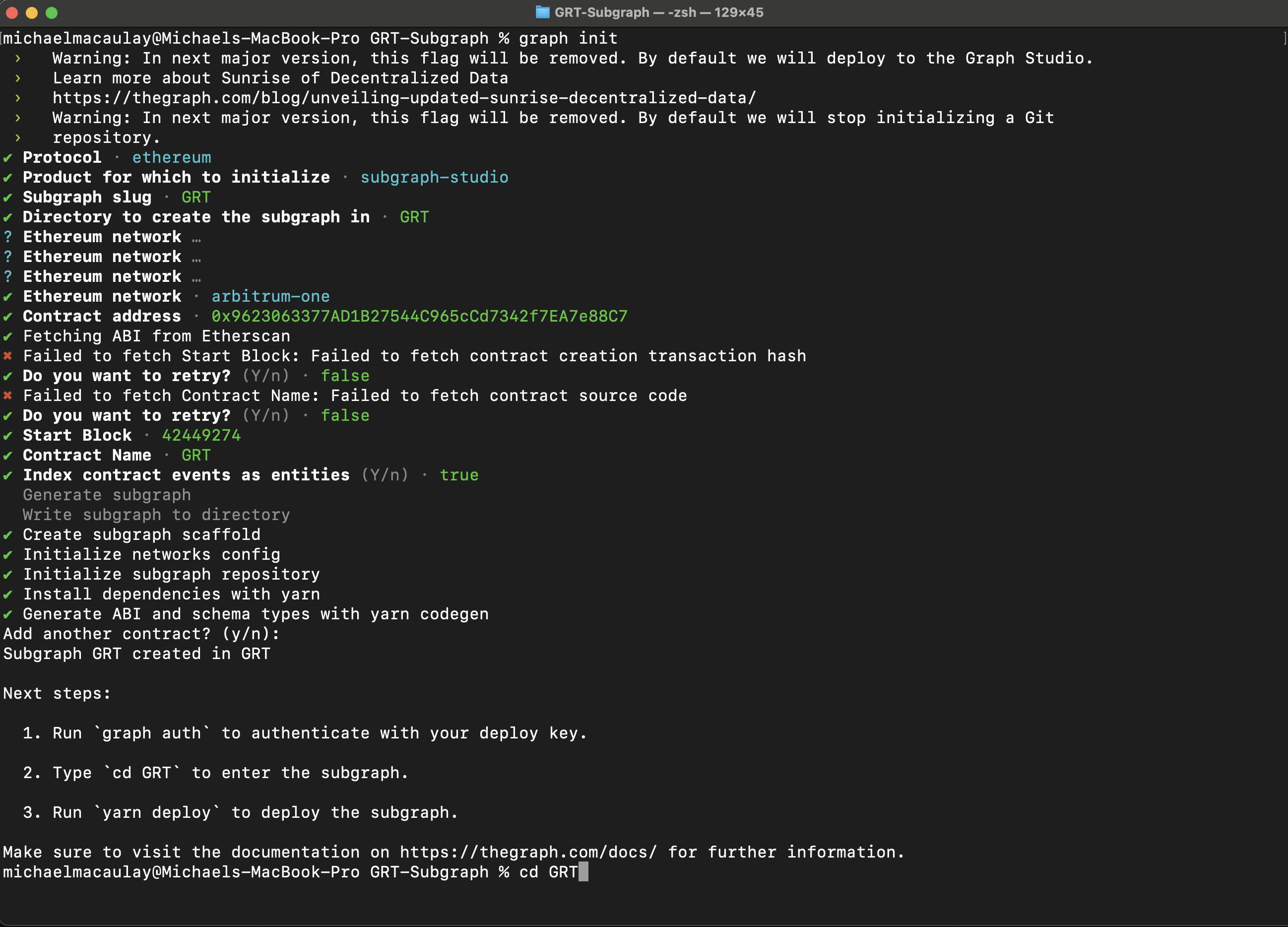 graph init <SUBGRAPH_SLUG>You'll be prompted to provide information about your subgraph: