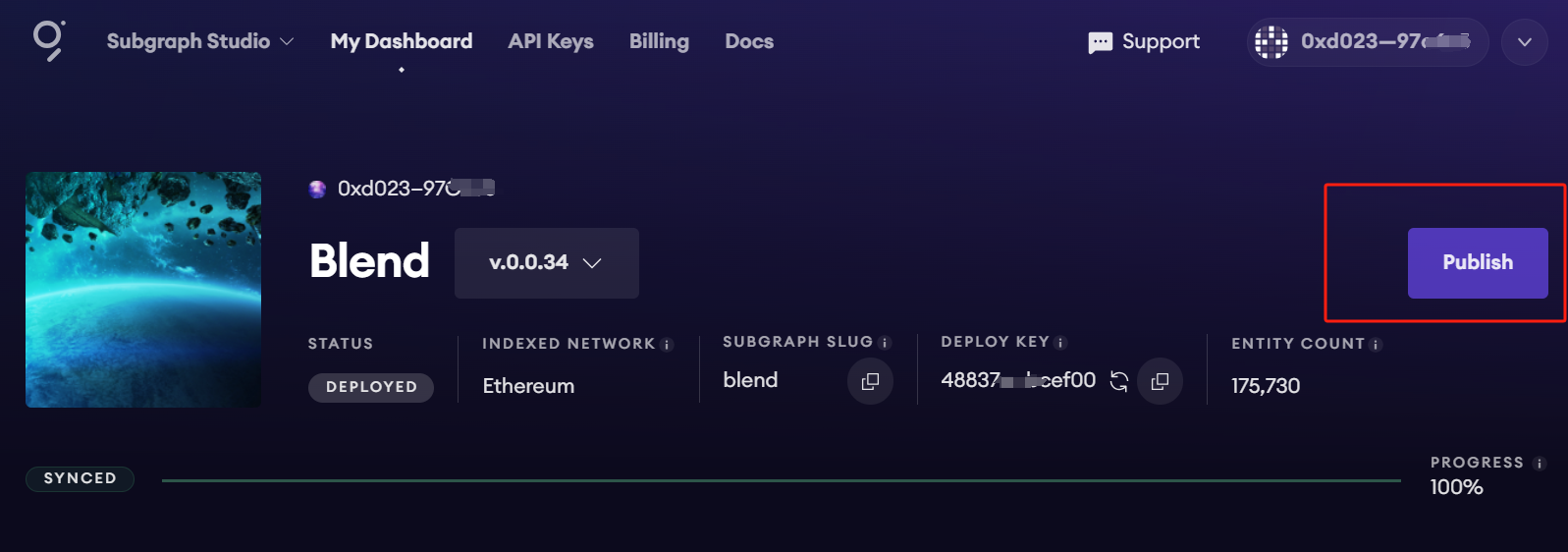 Once your subgraph is ready to be put into production, you can publish it to the decentralized network. On your subgraph's page in Subgraph Studio, click on the Publish button: